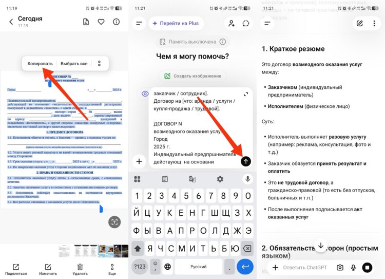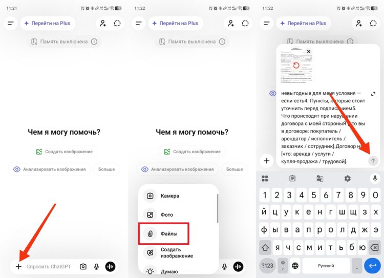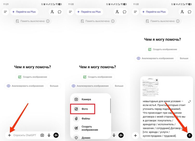 Перед тем как проверить договор через нейросеть, нужно правильно передать документ в чат. Сейчас почти каждая нейросеть, работающая с документами поддерживает текст, PDF и изображения, поэтому выбрать можно любой удобный способ. Я обращался к ChatGPT, но вы можете использовать любую бесплатную нейросеть, которая работает в России.