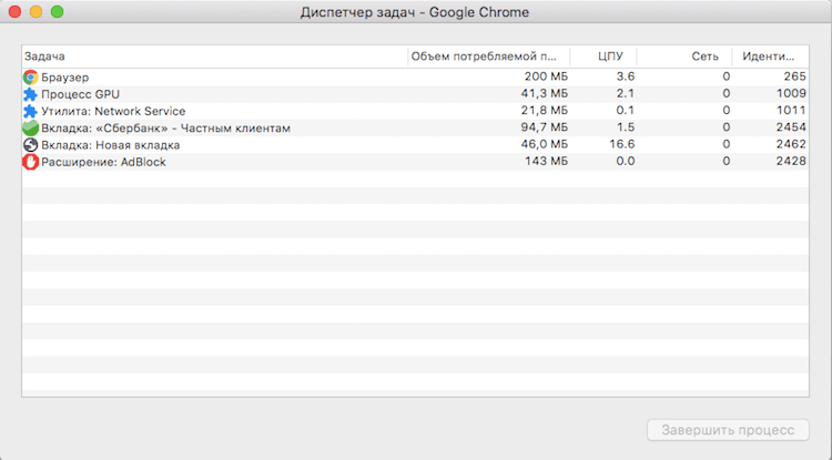 - Пролистайте список запущенных процессов и оцените объем памяти, который они потребляют. Иногда из-за сбоев в конфигурации сайт может расходовать в несколько раз больше ОЗУ, чем ему требуется в нормальных условиях. Это может замедлять работу браузера, а значит, лучше его отключить.