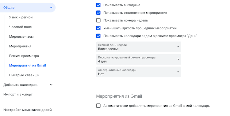- Затем перейдите во вкладку «Мероприятия из Gmail» и отключите параметр «Автоматически добавлять мероприятия из Gmail в мой календарь».