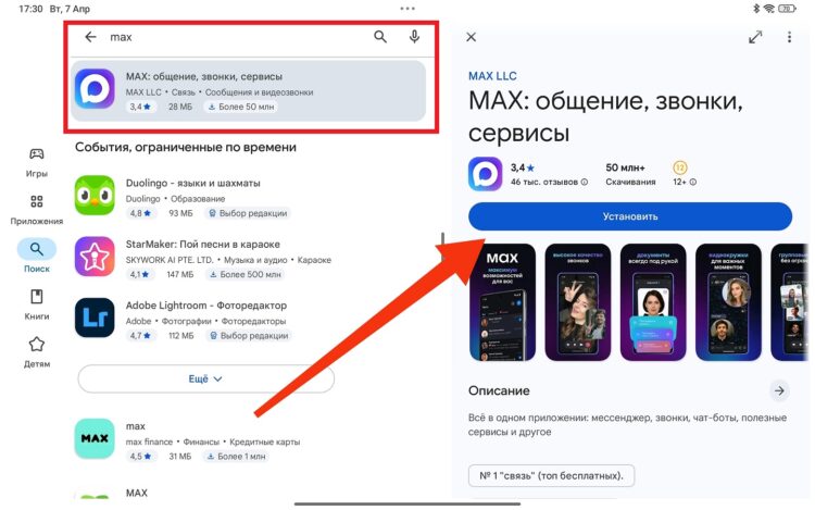 Если аккаунт Google зарегистрирован в другом регионе и приложение не отображается в поиске, воспользуйтесь одним из следующих способов. Подробнее про нюансы входа и первичной настройки — в материале как установить MAX на смартфон Android. Там те же шаги, что и для планшета.