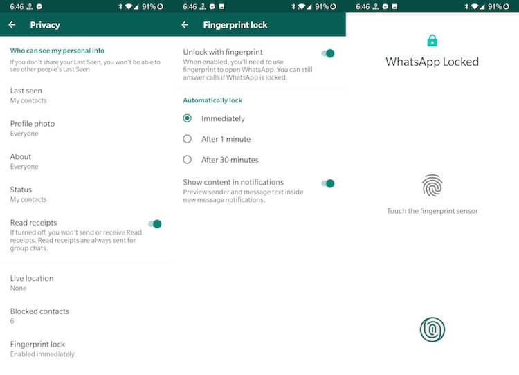 - Теперь выгрузите WhatsApp из памяти и попробуйте активировать его снова – для доступа к чатам придется воспользоваться отпечатком пальца.