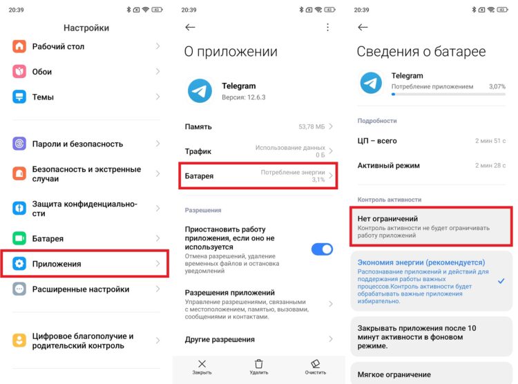 - Включите опцию «Не ограничивать» или «Разрешить фоновую работу».