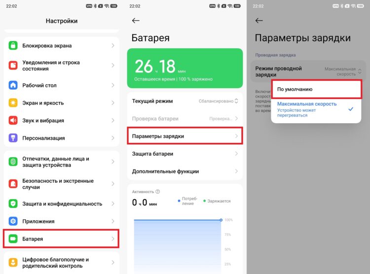 Отключите ускоренную зарядку. На Xiaomi 12T Pro это делается так: