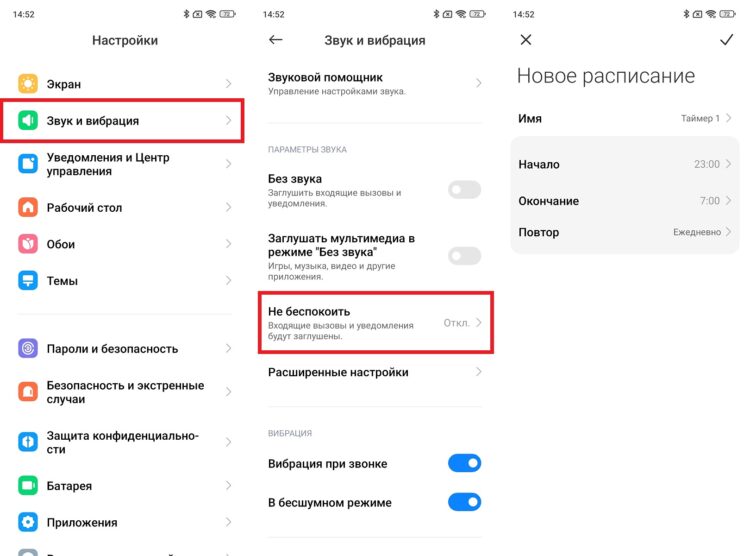 - Включите режим «Не беспокоить». Зайдите в «Настройки» — «Звуки и вибрация» — «Не беспокоить». Настройте расписание: например, с 23:00 до 7:00. В этом режиме телефон не будет звонить и вибрировать от уведомлений, но будильник сработает.