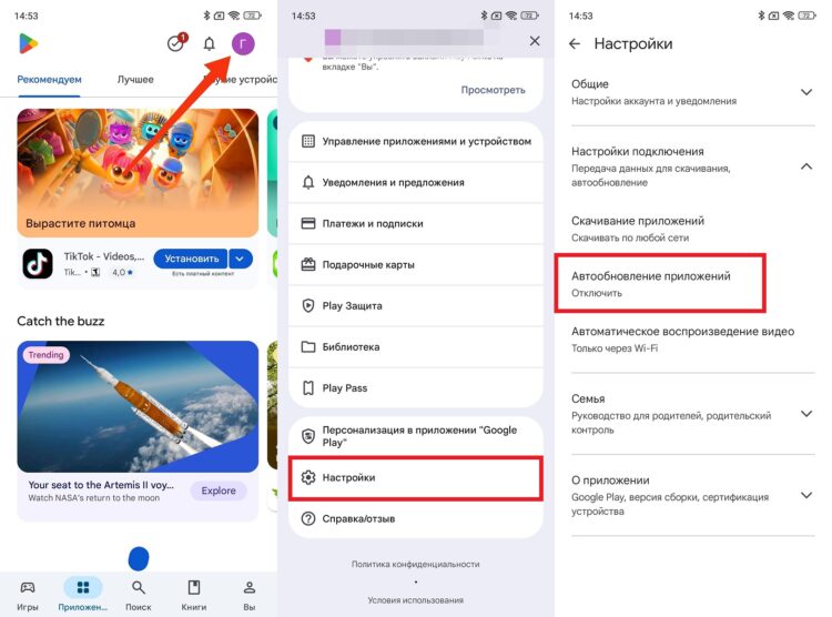- Отключите автообновление приложений. Откройте Google Play, нажмите на иконку профиля — «Настройки» — «Настройки подключения» — «Автообновление приложений» — выберите «Никогда». Обновления лучше запускать самостоятельно в удобное время.