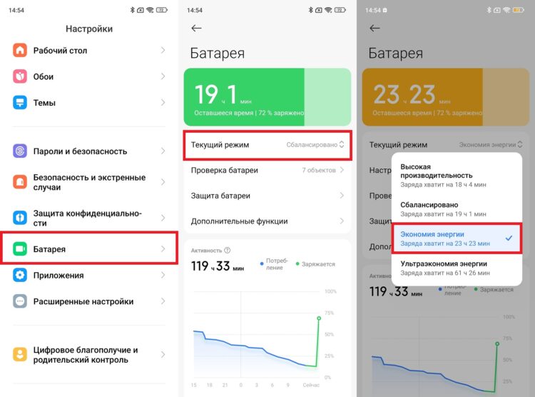 - Включите режим энергосбережения. «Настройки» — «Батарея» — «Энергосбережение». В этом режиме система ограничивает фоновую активность приложений и снижает частоту обновления экрана. Заряд расходуется заметно медленнее.