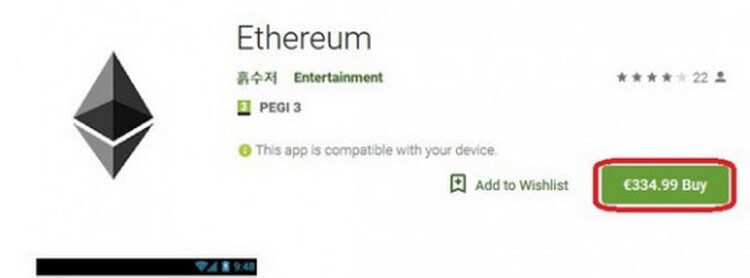 В каталоге Google Play появилось приложение Ethereum стоимостью 334,99 евро, которое якобы включает в себя один эфир. И мало того, что разработчики «продают» токен почти на 100 евро дороже рыночной стоимости, так еще предоставляют не реальную монету, а фото его логотипа.