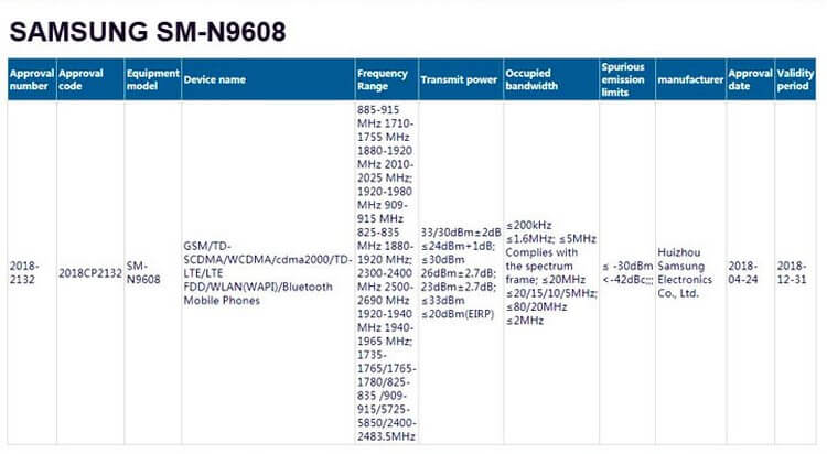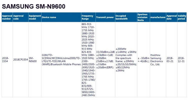 В регистрационных документах содержится упоминание о двух моделях Galaxy Note 9 под кодовыми номерами SM-N9600 и SM-N9608. К сожалению, на сайте ведомства отсутствует информация о внешнем виде смартфонов и их аппаратных спецификациях. Единственное, что упоминается в актах регулятора, — поддерживаемые сотовые частоты, с которыми будут работать новинки.