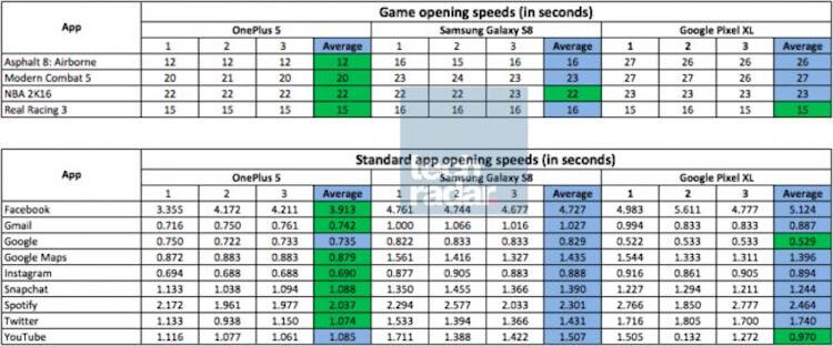 Как сообщают представители ресурса TechRadar, информацией поделился проверенный источник, близкий к OnePlus. В таблице находятся результаты запуска игр и приложений. В тесте участвовали OnePlus 5, Samsung Galaxy S8 и Google Pixel XL.