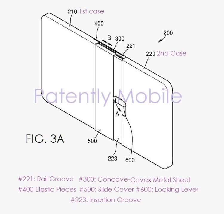 Как видно на изображении из патента, блокирующий механизм состоит из двух основных частей: скользящей вдоль корпуса крышки и откидного блокиратора. Таким образом, в разложенном состоянии крышка, закрепленная в пазах на гранях корпуса, сдвигается в сторону, а блокиратор переводится в такое положение, чтобы сопротивляться крышке. Для того чтобы сложить устройство пополам, вам необходимо переместить блокиратор в исходное положение и сдвинуть крышку на другую половину корпуса устройства.