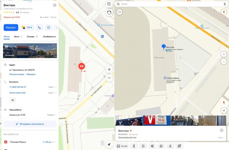 Яндекс заявляет, что может показывать вход в некоторые здания. Вот только и здесь есть проблема. 2ГИС делает это значительно точнее. Посмотрите на вот этот пример с тренажерным залом. Яндекс предлагает вам зайти по центру здания. Вот только эта дверь ведет к другим организациям. А вам надо пройти чуть дальше, как это показывает 2ГИС, к следующему входу. И этот момент в зданиях с несколькими входами, расположенными рядом, становится критичным.