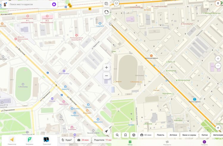 Внешний вид карт практически одинаков. Если убрать все опознавательные знаки, вы вряд ли определите на глаз, какой сервис вам показывают. Да и детализация находится в обоих случаях на отличном уровне. Здесь следует отметить, что для 2GIS Новосибирск, где я живу, является домашним регионом, а значит, именно здесь качество карты и ее наполненность будет всегда на отличном уровне. Но Яндекс совершенно не отстает и даже показывает совсем недавно установленные шлагбаумы. Поэтому, если смотреть на качество самих карт, то здесь полный паритет. Единственное, в 2ГИС отображается больше парковок.