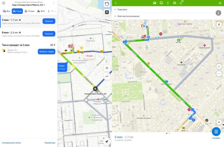 Навигатор строит одинаковые маршруты в обоих сервисах. Яндекс карты слева, 2ГИС справа.