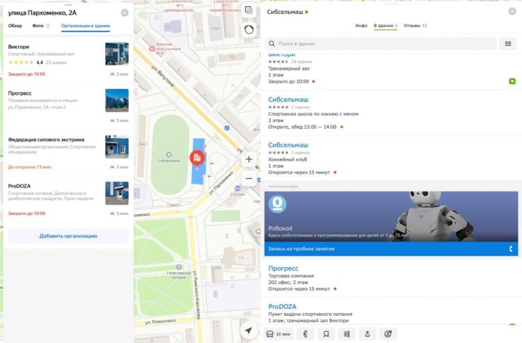 А вот что касается наполненности карт различными организациями и отзывами, здесь все не так однозначно. Давайте посмотрим на пример по одному адресу. Яндекс находит здесь четыре организации, а 2GIS — пять. И это касается большого количества объектов в городе. А самое забавное, что там, где на Яндекс Картах отображается Федерация силового экстрима, если открыть фотографию организации, можно увидеть как раз школу по хоккею с мячом. И это неточность только по одному адресу. Если начать пользоваться Картами с точки зрения поиска организаций, то такое будет встречаться часто.