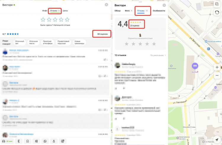 Тоже самое касается и отзывов. Просто посмотрите разницу в количестве отзывов в 2ГИС и Яндекс Картах на тренажерный зал. В первом 35 отзывов и 36 оценок, а в другом — 12 отзывов и 23 оценки. Разница, я бы сказал, значительная. И это не по какой-то одной организации, а практически по всем. Но отзывы можно почитать и в интернете. А картами пользуются еще и для того, чтобы найти нужные объекты или вход в них.