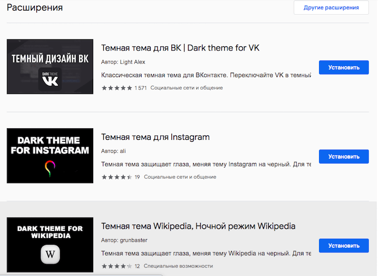 Другая проблема Chrome Web Store – совершенно бестолковый поиск. Я прекрасно знаю, что в каталоге есть масса решений, которые позволяют активировать в браузере ночную тему, но на свой запрос «ночная тема» я увидел только три расширения, и то – для VK, Wikipedia и Instagram.