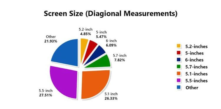 Лидером разрешения стал Full HD, на который приходится 72 процента. У флагманов с разрешением 2560 х 1440 пикселей почти 14 процентов. Если говорить о диагонали, здесь побеждают 5,5-дюймовые панели с 28 процентами. Сразу за ними — 5,1 дюйма.