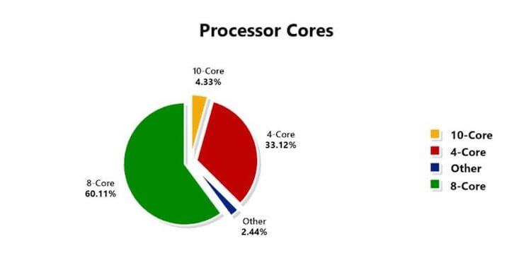 Чаще всего бенчмарк посещают владельцы устройств с чипом Qualcomm, 10 ядрами и 4 ГБ оперативной памяти. Доля 6 ГБ оперативки отстаёт всего на 3 процента.